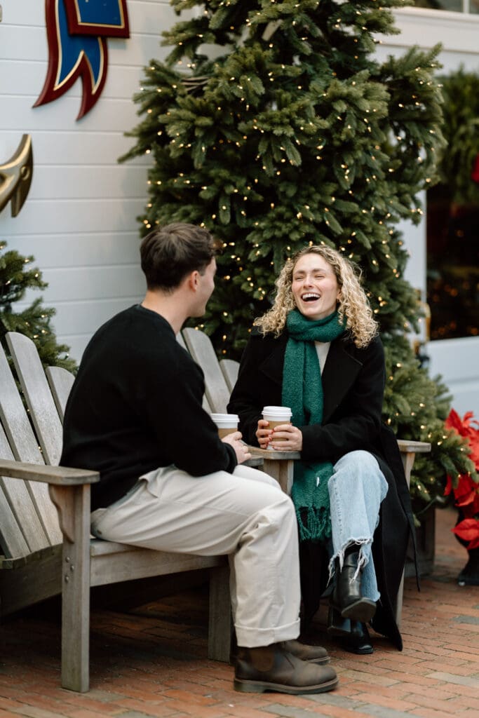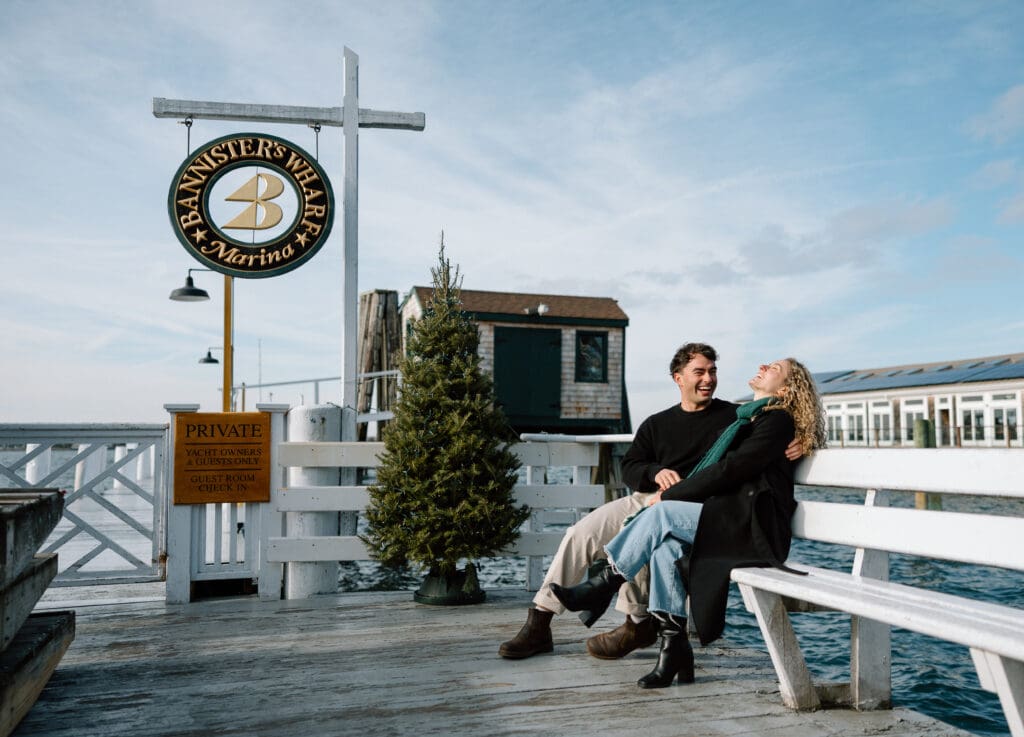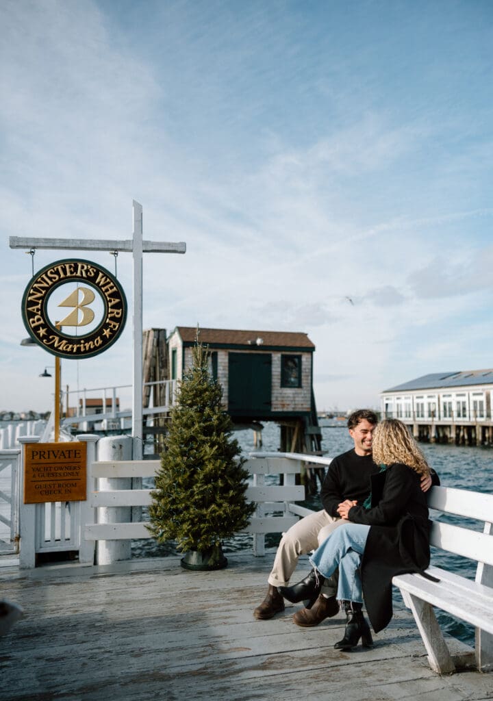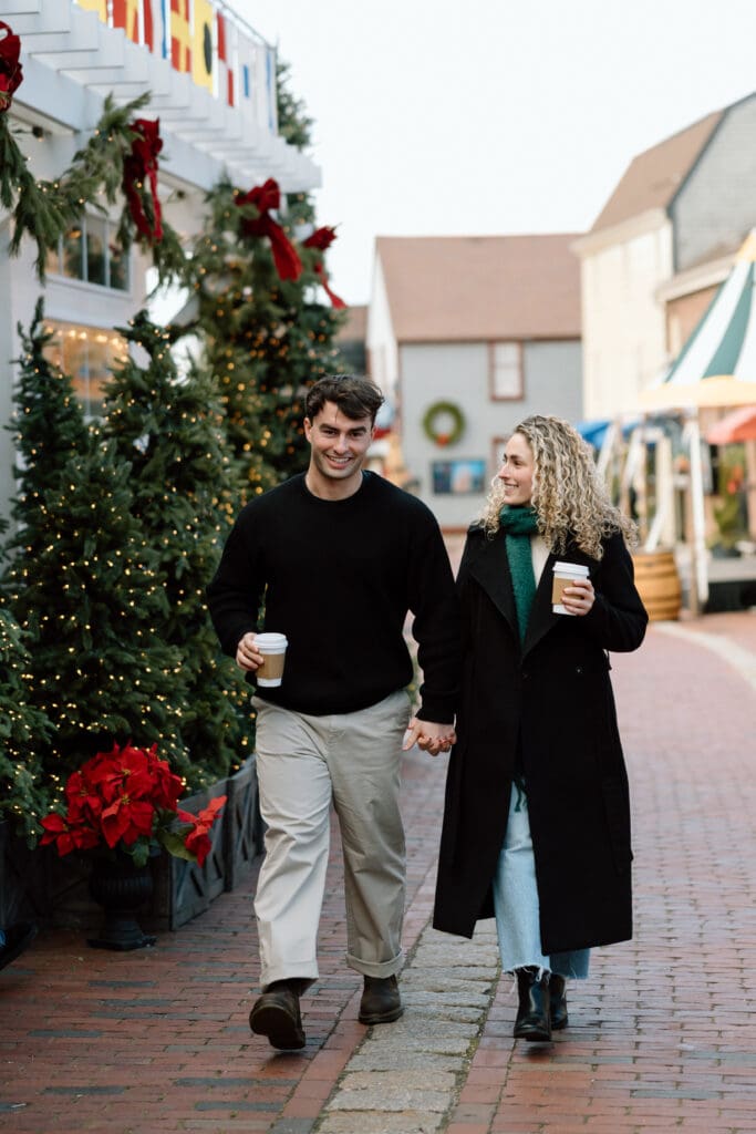 Taking photos on the wharf in Newport, Rhode Island during the holiday season always feels special. The docks are quieter, the boats are wrapped up for winter, and the town has a slower, more relaxed energy. This session was simple and easy. We walked along the wharf, grabbed coffee, and let the morning unfold naturally. Lots of smiles, a little laughter, and plenty of in-between moments. Nothing staged or forced, just the two of them enjoying being together.