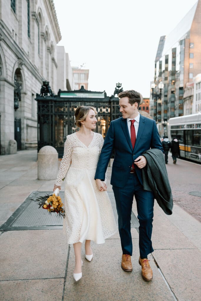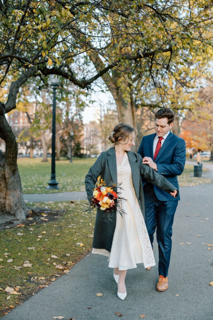 Once they were ready, we stepped outside and started walking down Commonwealth Avenue. One of the things I love most about photographing elopements in Boston is how walkable everything is. You don’t need a packed timeline or transportation plan, just good shoes and a little curiosity!